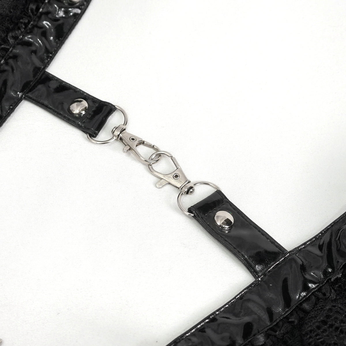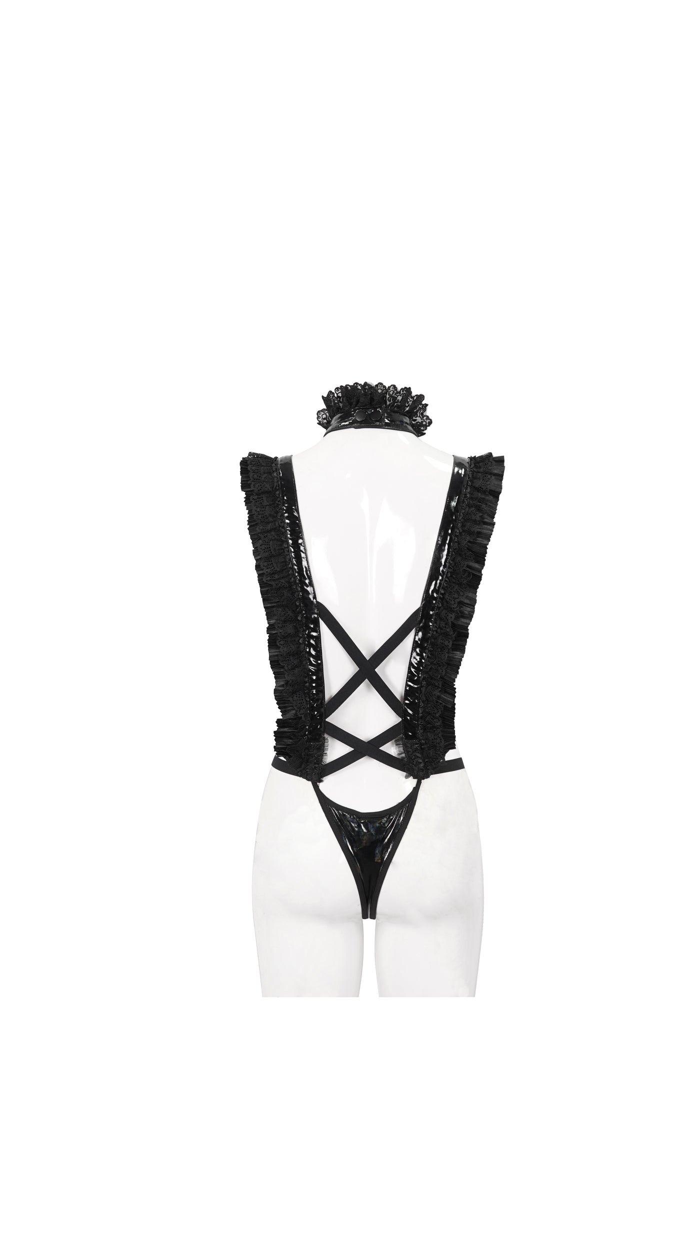 Das elastische Spitzenband im Vorderteil, der markante Lack-Choker mit Rundnieten sowie die kunstvoll überkreuzten Rückenbänder machen „Obsidian Seductress“ zu einem unwiderstehlichen Highlight. Der zugehörige Lack-String rundet den erotisierenden Look ab und verleiht dem Body eine rebellische, geheimnisvolle Ausstrahlung.