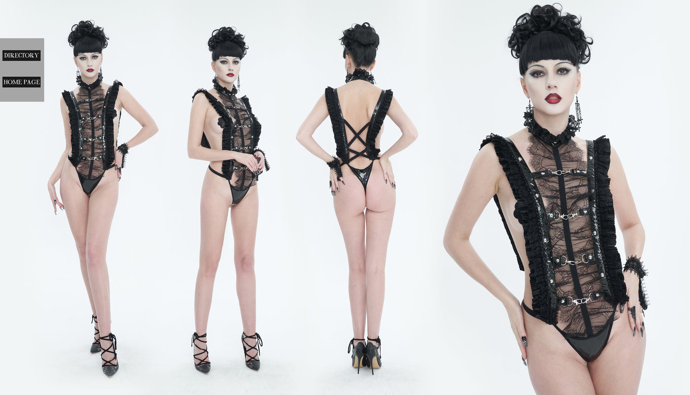 Dunkle Verführung in ihrer kunstvollsten Form. Der Harness-Body „Obsidian Seductress“ vereint laszive Gothic-Eleganz mit burlesker Sinnlichkeit. Feine Spitze, glänzende Lackelemente und dramatische Plisseerüschen erschaffen ein Design, das nicht nur verführt, sondern dominiert. Seitlich offen und mit verführerischen Linien betont dieser Body jede Bewegung und jede Kurve.