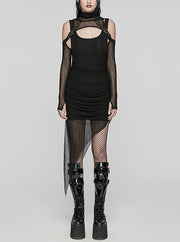 Das kurze, figurbetonte Kleid begeistert mit seitlichen Raffungen, die die Taille betonen, sowie einem asymmetrischen Zipfelsaum, der für Bewegung und Dramatik sorgt. Das Mesh-Overlay über dem Jersey-Stoff bringt Tiefe und Struktur ins Design.