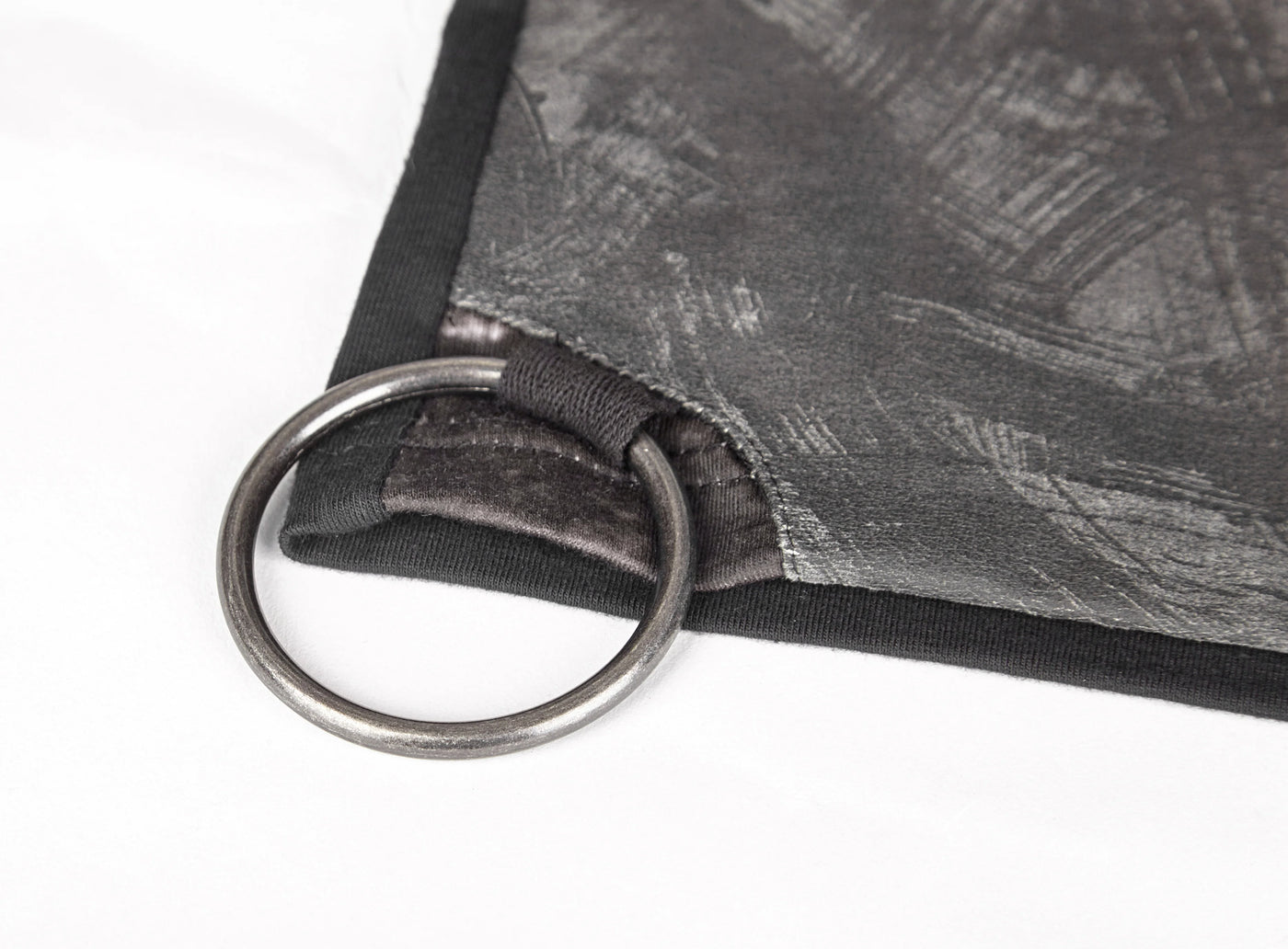 halbrunde bronzefarbene Nieten an der linken Schulter und ein Metall-O-Ring am rechten Saum