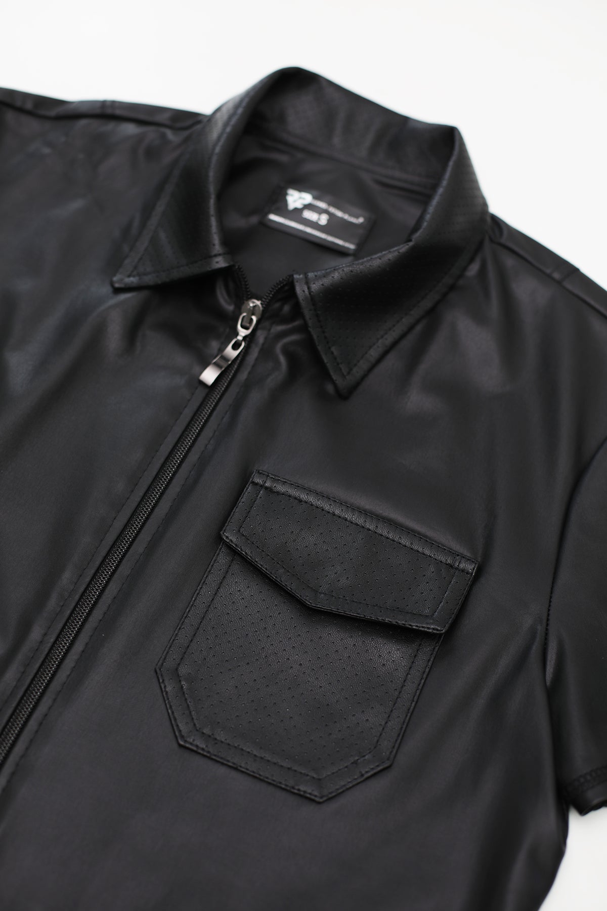 Black wet look polo shirt. The front features a beautiful collar and a perforated wet look pocket. A dark zipper with two zipper pulls—detachable from both the top and bottom—adds further character. The zippers are engraved with the RFP Regnes Fetish Planet logo. Two vertical stitches are located on the back. They visually slim the figure at the waist and broaden the shoulder and chest lines. This effect makes the silhouette appear more muscular. The decorative black stitching on the sleeves and along the entire hem also deserves special attention. The signature red Alcantara label with the RFP logo will delight anyone who appreciates sophisticated and unique details. The shirt pairs perfectly with the RMVincenzo001 pants—visible in the pictures. The item is packaged in a box with a picture. Care instructions: 30 degrees hand wash Color: black Material: 95% Polyester / 5% Elastane Available sizes: S - 5XL