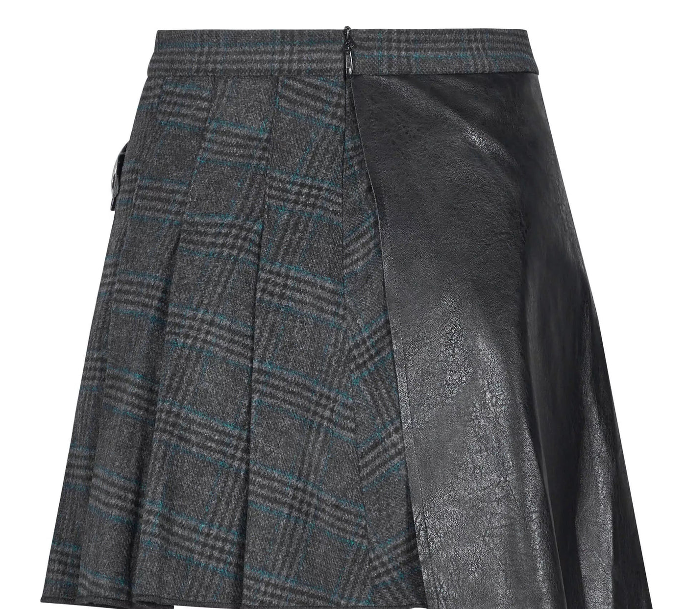 Asymmetrical design: pleated tartan on the left, vegan leather overlay on the right