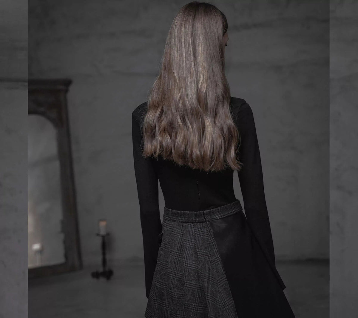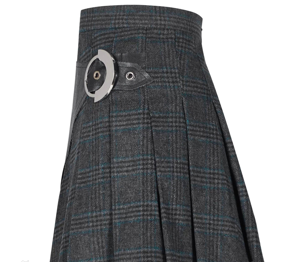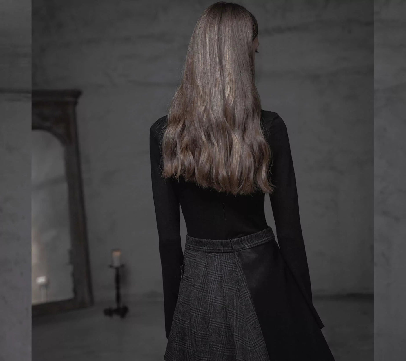 modern silhouette: A softly draping, grey-blue tartan pleated skirt meets a