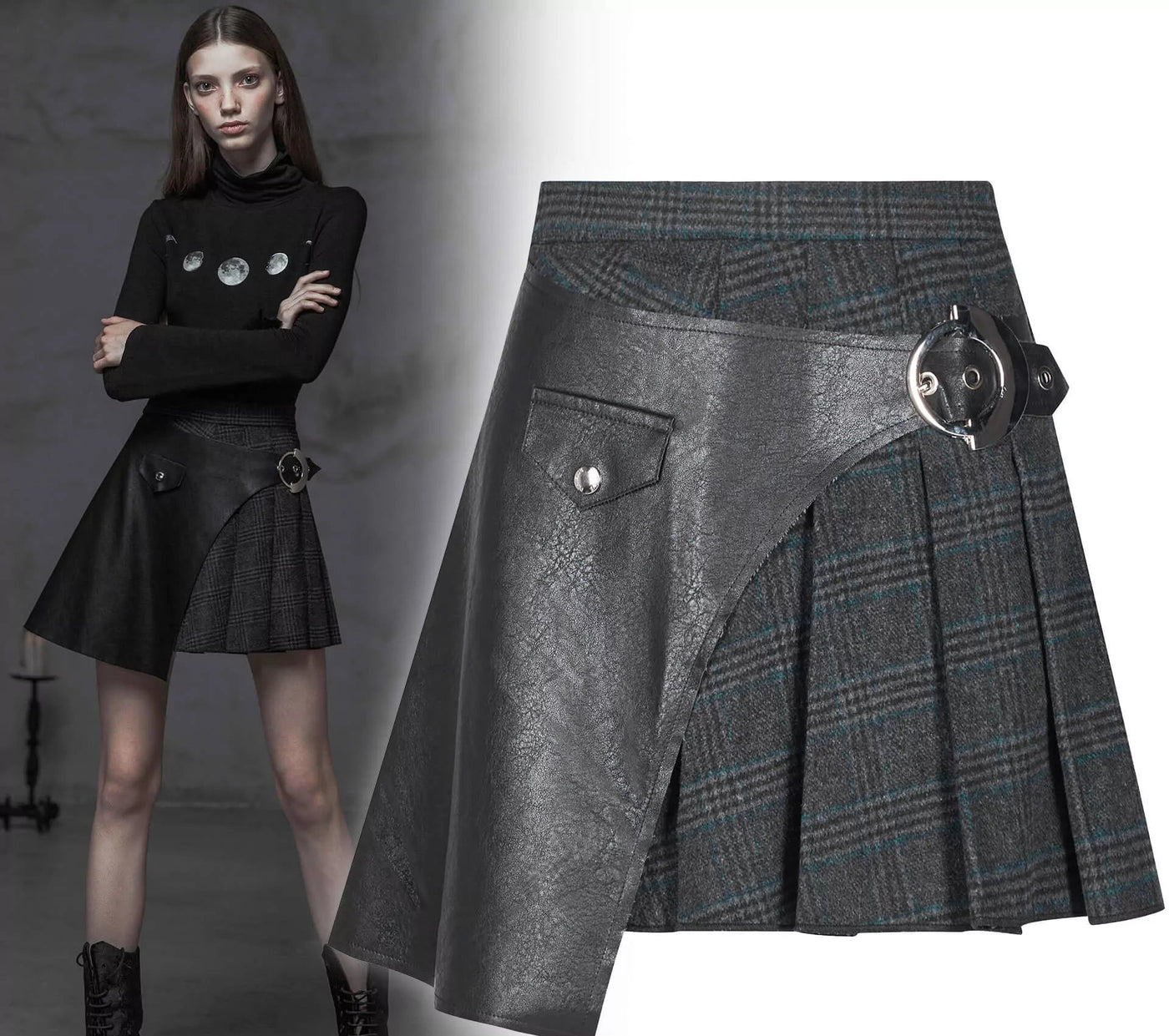 Punk Rave Masumi Gray Skirt – Asymmetrical mini skirt made of tartan & vegan leather