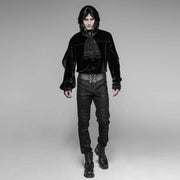 Punk Rave 's "Syndicate Men's Pants" combine Victorian elegance with sophisticated Gothic charm and a touch of industrial edge . These exceptional men's trousers feature an artfully crafted faux leather cummerbund with an embossed paisley pattern, meticulously detailed antique-style buttons, and magnificent passementerie embellishments.
