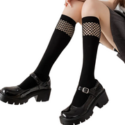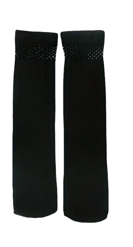 These black knee-high socks with a net accent are the perfect statement between innocent and seductive . The upper section made of fine mesh fabric provides an exciting contrast to the opaque fabric – a subtle but effective eye-catcher that enhances any outfit.