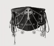 Das Design besticht durch seine aufwendige Symbolik: Ein zentrales, prunkvolles Kreuz wird von filigranen Ketten flankiert, an denen detaillierte Spinnennetz-Anhänger und kleine Totenköpfe hängen. Dank des breiten, elastischen Bandes und der seitlichen Schnürungen schmiegt sich der Gürtel perfekt an deine Taille an und zaubert eine atemberaubende Form, während er gleichzeitig höchsten Tragekomfort bietet.