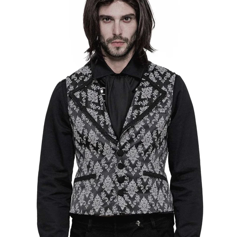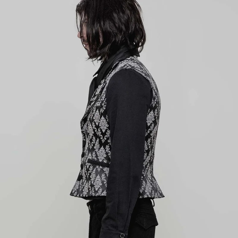 Die Gothic-Herrenweste „Velarium Obscura“ verkörpert viktorianische Noblesse in ihrer reinsten Form. Das fein gewebte Damastmuster in Schwarz und Weiß verleiht der Weste eine kühle, aristokratische Ausstrahlung, die gleichermaßen edel wie geheimnisvoll wirkt.