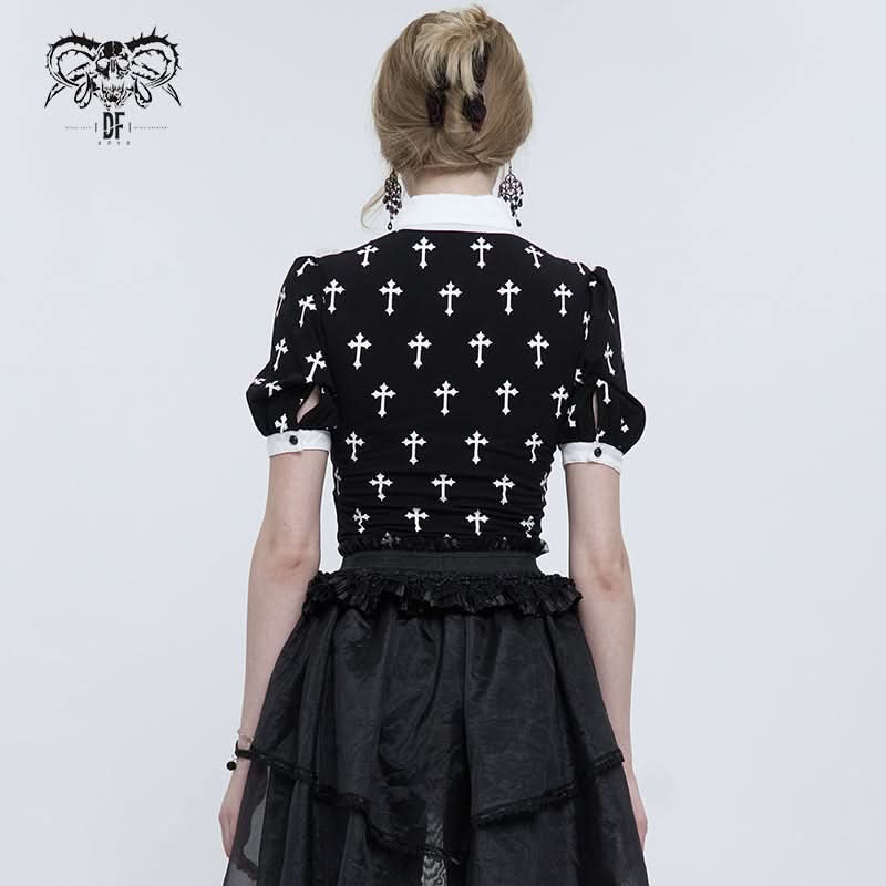 Devil Fashion Gothic Blusentop „Falling Crucifix“ mit Kreuzprint & Rüschenkragen