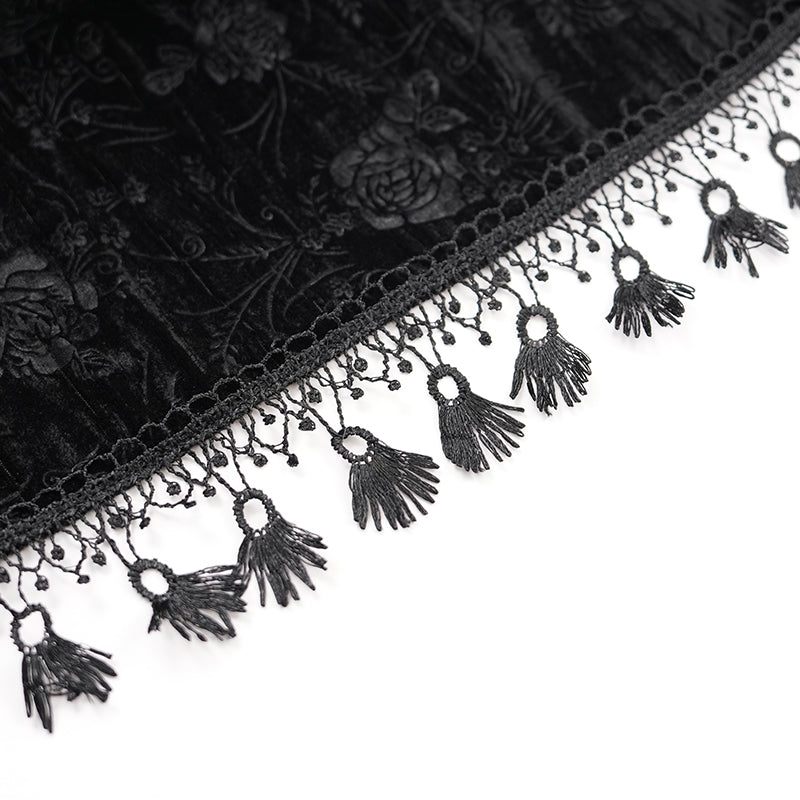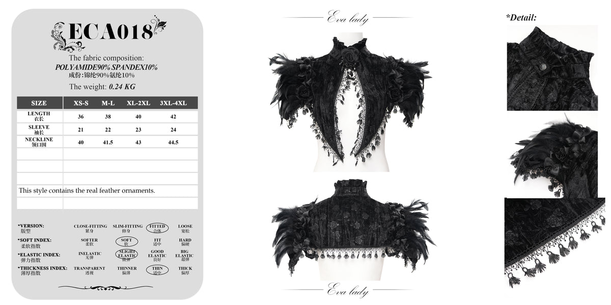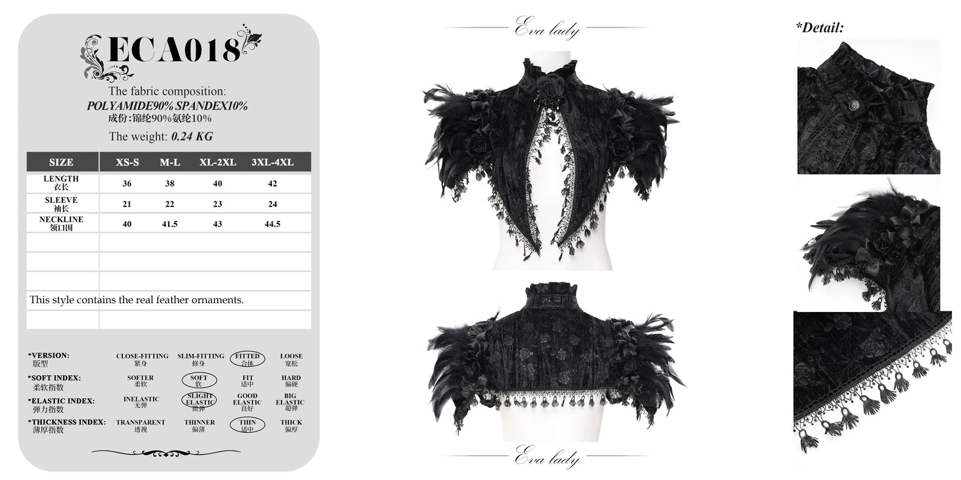 Dieser viktorianisch inspirierte Gothic Bolero aus Samt von Eva Lady ist kein bloßes Accessoire, sondern ein echtes Statement-Piece. Mit seinem geprägten Rosenrelief, üppigen Federakzenten an den Schultern und detailreichen Verzierungen verbindet er dramatische Eleganz mit mystischem Gothic-Charme.