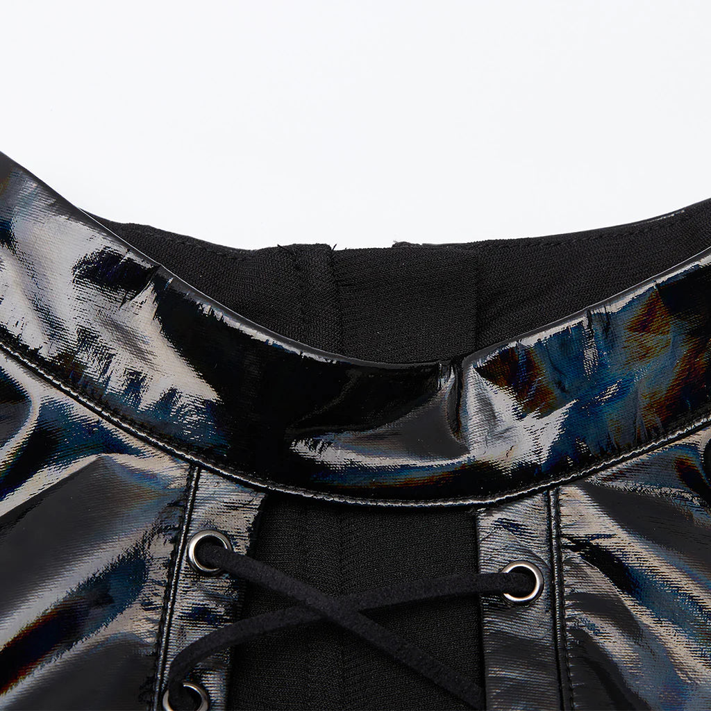 Glanz. Kontrolle. Provokation. Das Minikleid von Punk Rave ist pure futuristische Verführung. Gefertigt aus holografischem Lackstoff mit Oil-Spill-Effekt, verbindet dieses Kleid Cyberpunk-Ästhetik, Fetish-Vibes und moderne Gothic Clubwear zu einem kompromisslosen Statement.